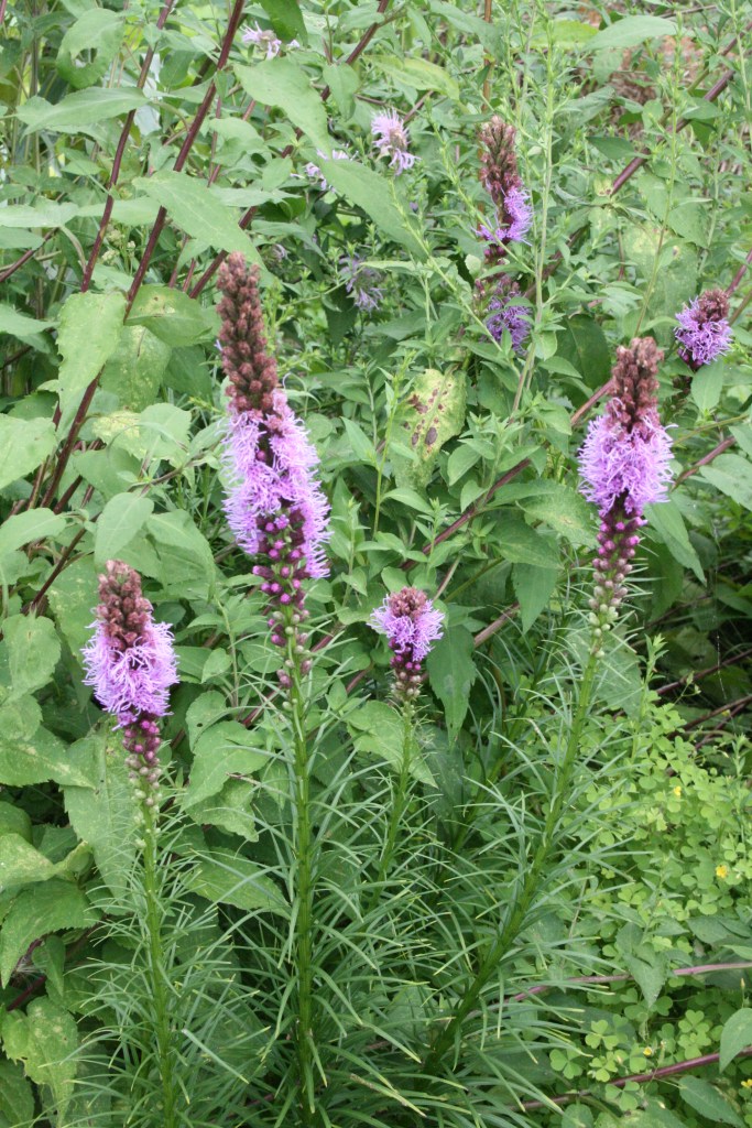 Liatris: Blazing Stars are gorgeous and bloom, and well beloved by our pollinators. The tall spears of purple blooms stand out in a prairie. Liatris spicata is the most commonly seen species, but there are others native to our area in Ohio.