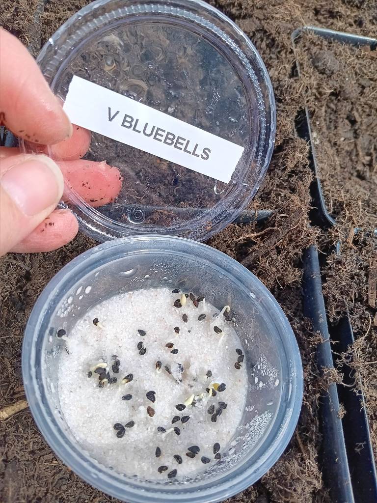 Once flowering is finalized, Virginia Bluebells begin their dormancy in early June as surrounding trees leaf out and their foliage dies back. The seeds produced need at least 60 days of cold stratification, and will, like many spring ephemerals, sprout while still being kept in the fridge. First year seedlings grow a few leaves before going dormant; the root looks much like a small tuber. You may be blessed with blooms in the second year, but guarantee them by the third if planted in ideal circumstances.